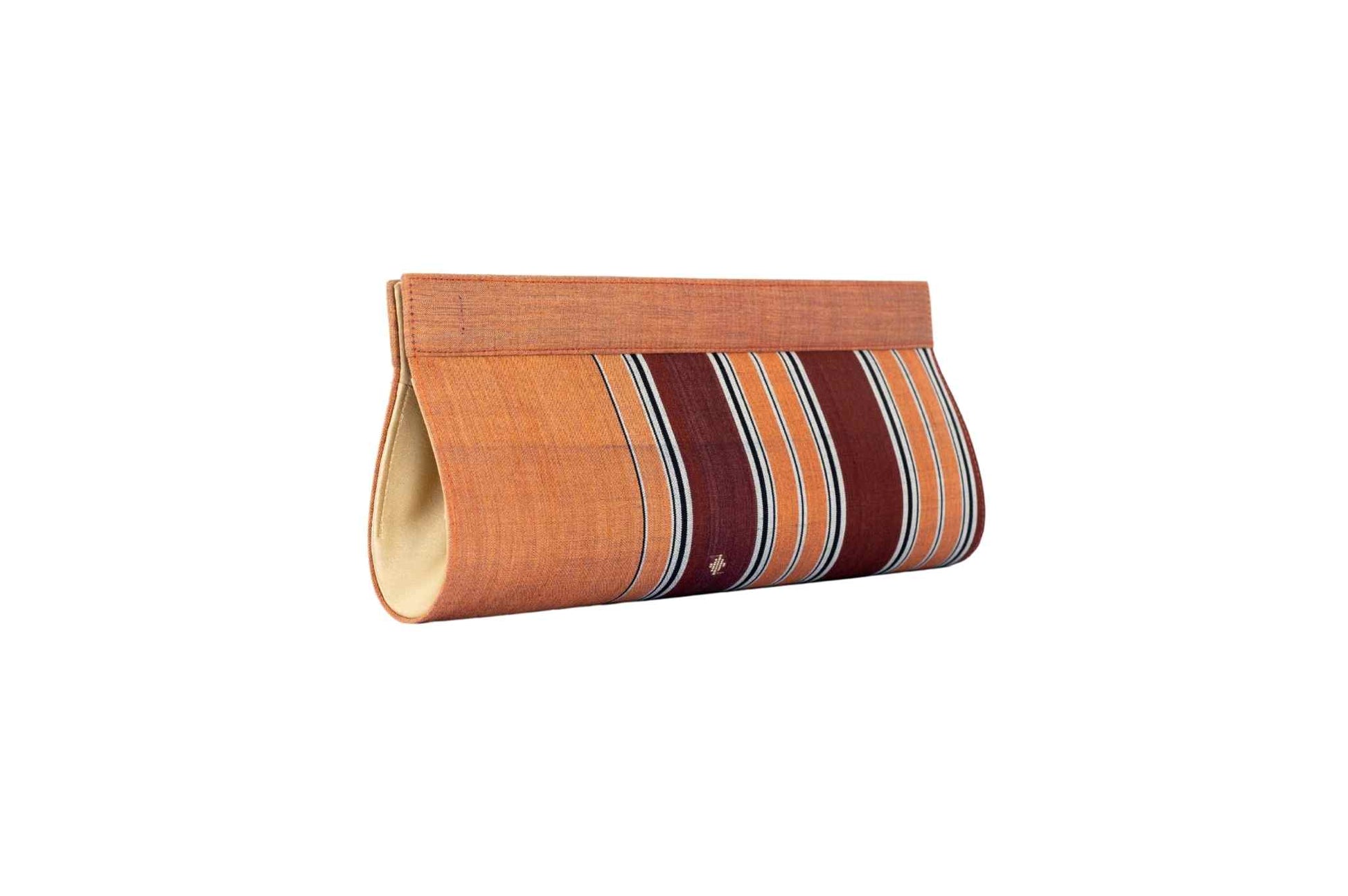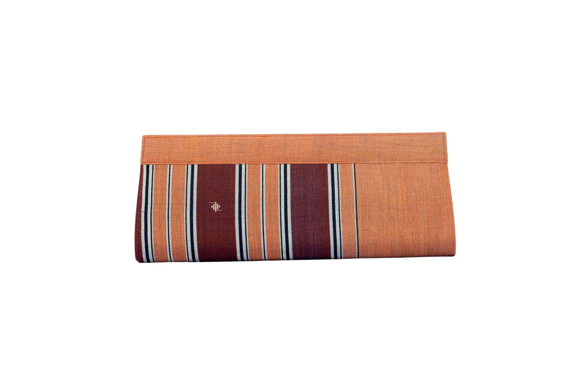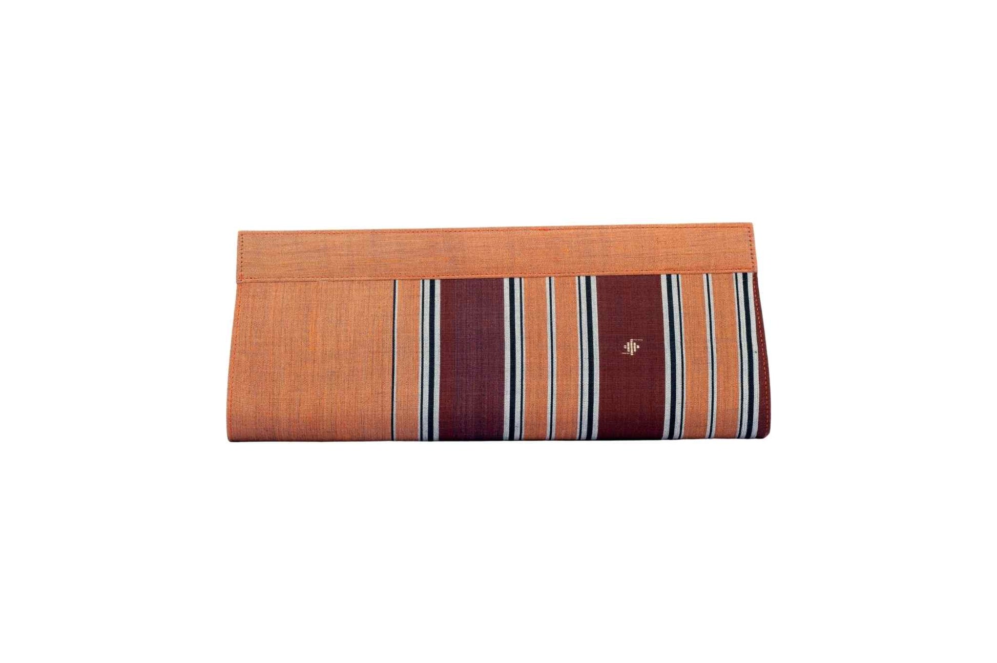 Vertical stripes Cannoli clutch in tangerine, brown, black, and white colour, embroidered with Spanish Cherry pattern in cream cotton threads