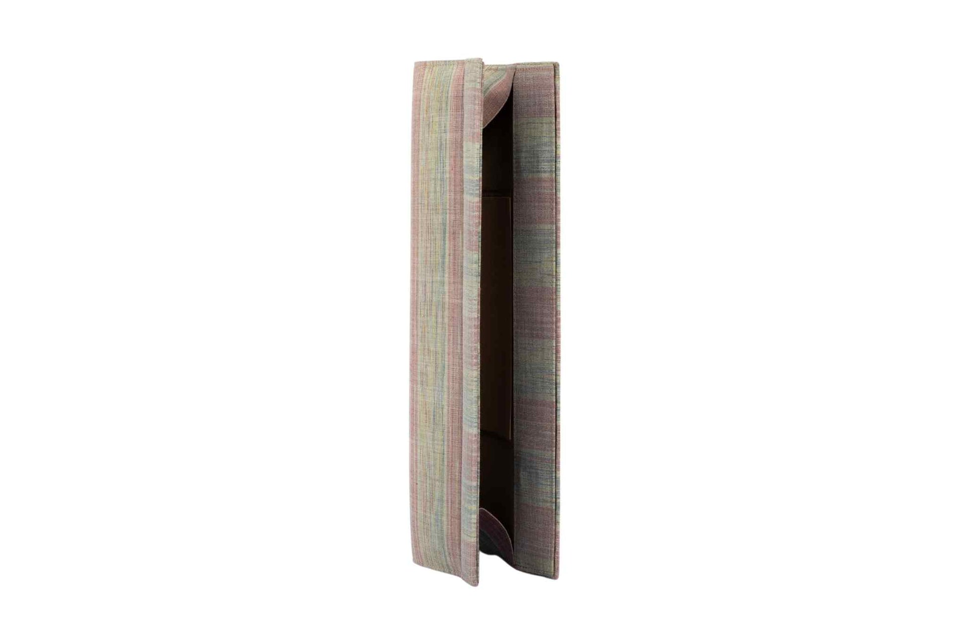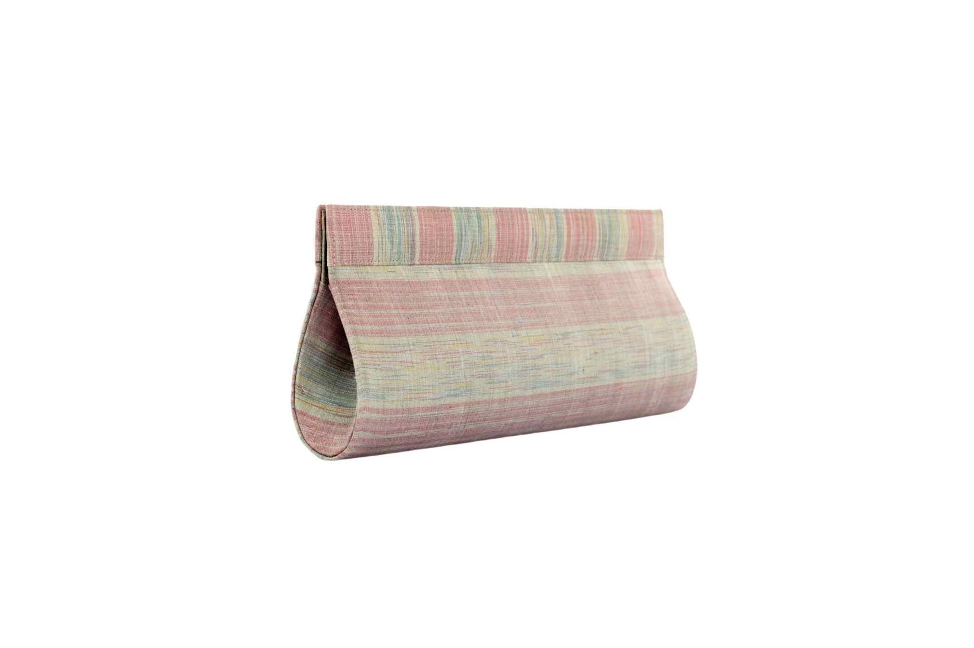 Our signature Cannoli clutch is hand-crafted in Tenun Pahang Diraja by Cheminahsayang. This fabric is a prime example of an overall stripe pattern that has the 'heavy rain' effect which gives it a unique texture. Each fabric is handwoven in Pahang, Malaysia, and then hand-crafted in Thailand. Every piece of fabric is one of a kind.