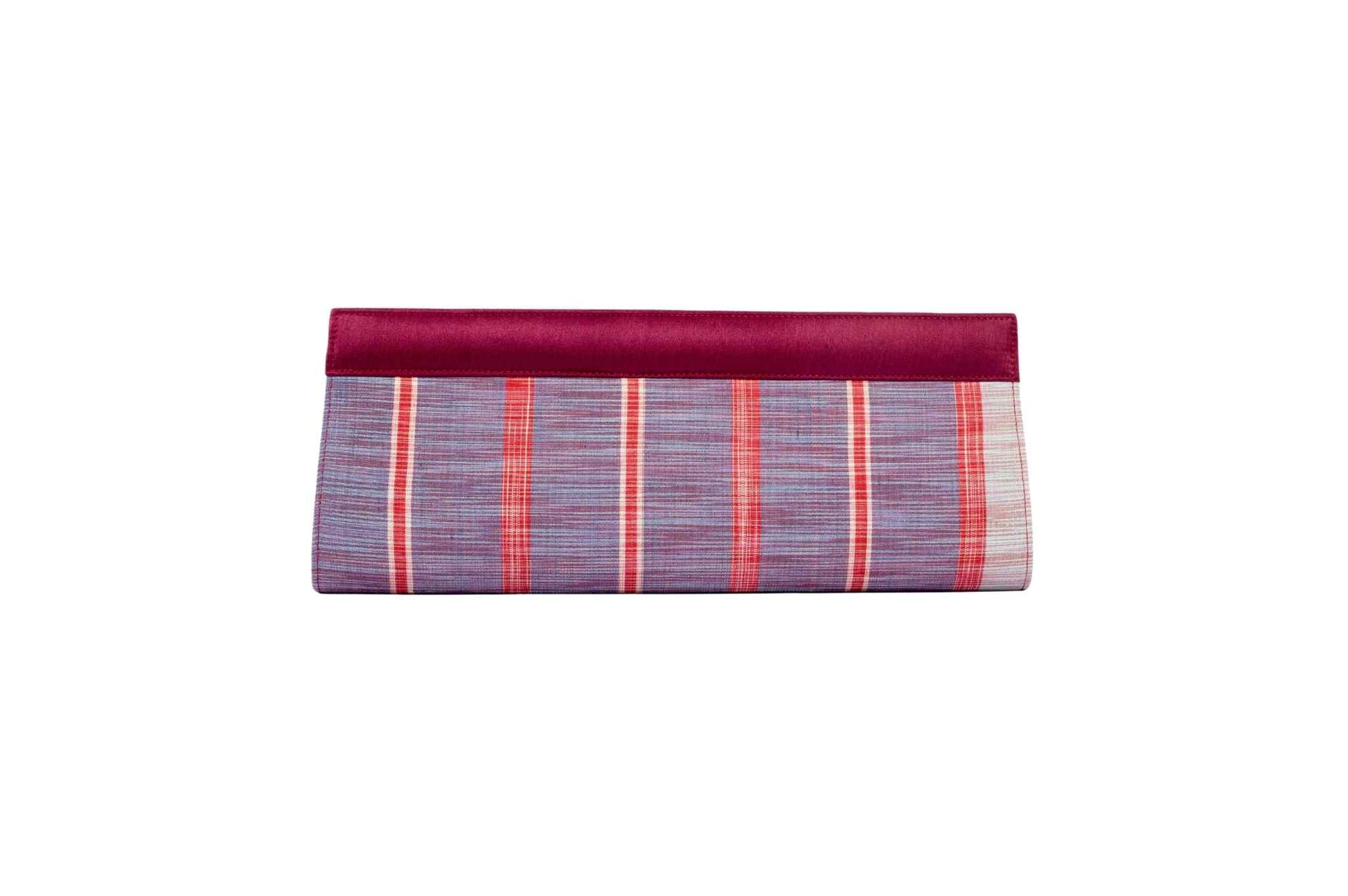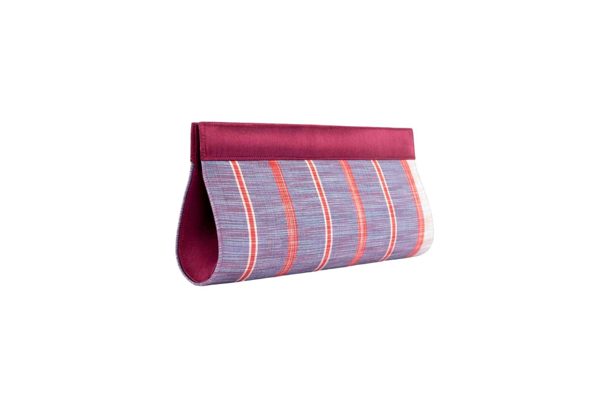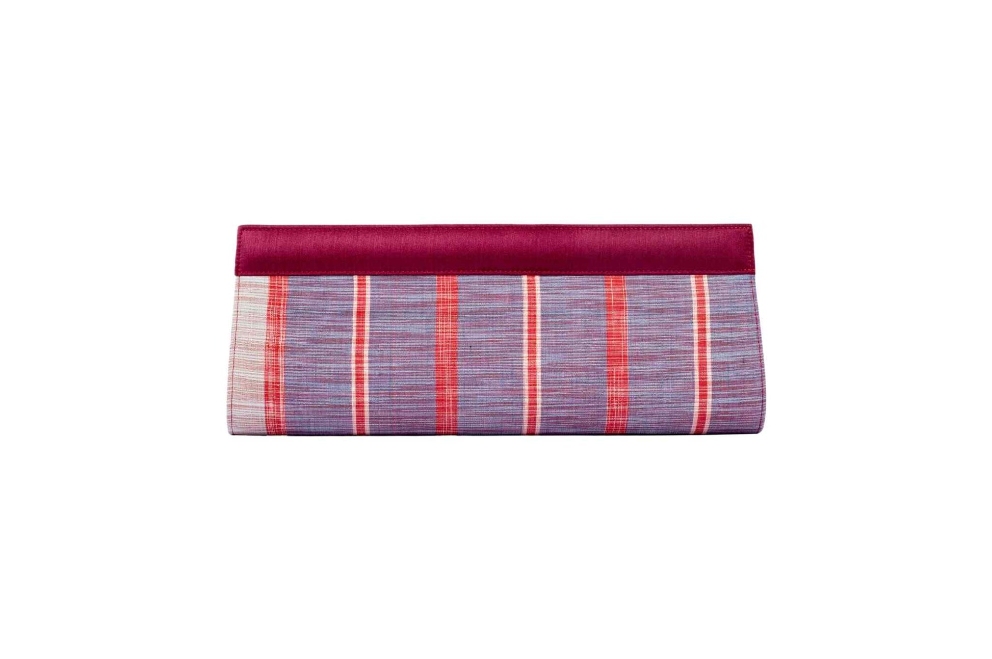 Vertical stripes Cannoli clutch in red, white, and blue colour with Nibong Ikat pattern.