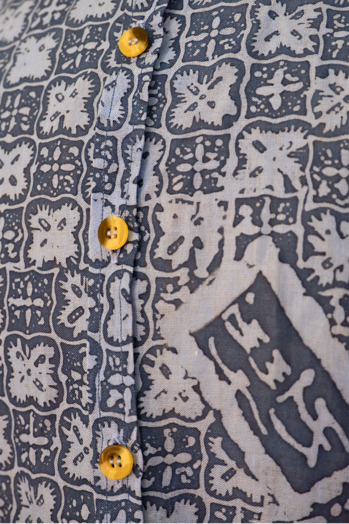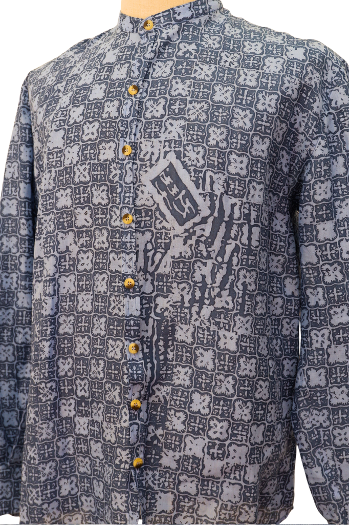 Long-Sleeved Men’s Shirt crafted in hand-blocked batik by Batek Cheminahsayang on breathable linen. Wooden blocks from the private collection of Her Majesty Queen Azizah are dipped in hot wax and carefully stamped onto the fabric before dye is applied. Each piece carries the legacy of traditional craftsmanship combined with contemporary wearability.