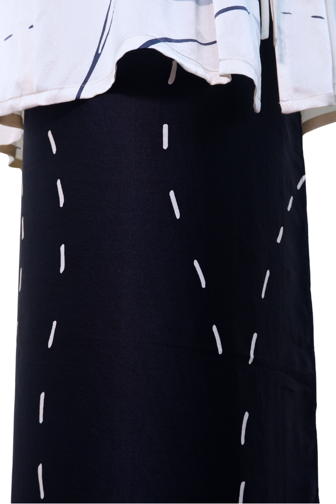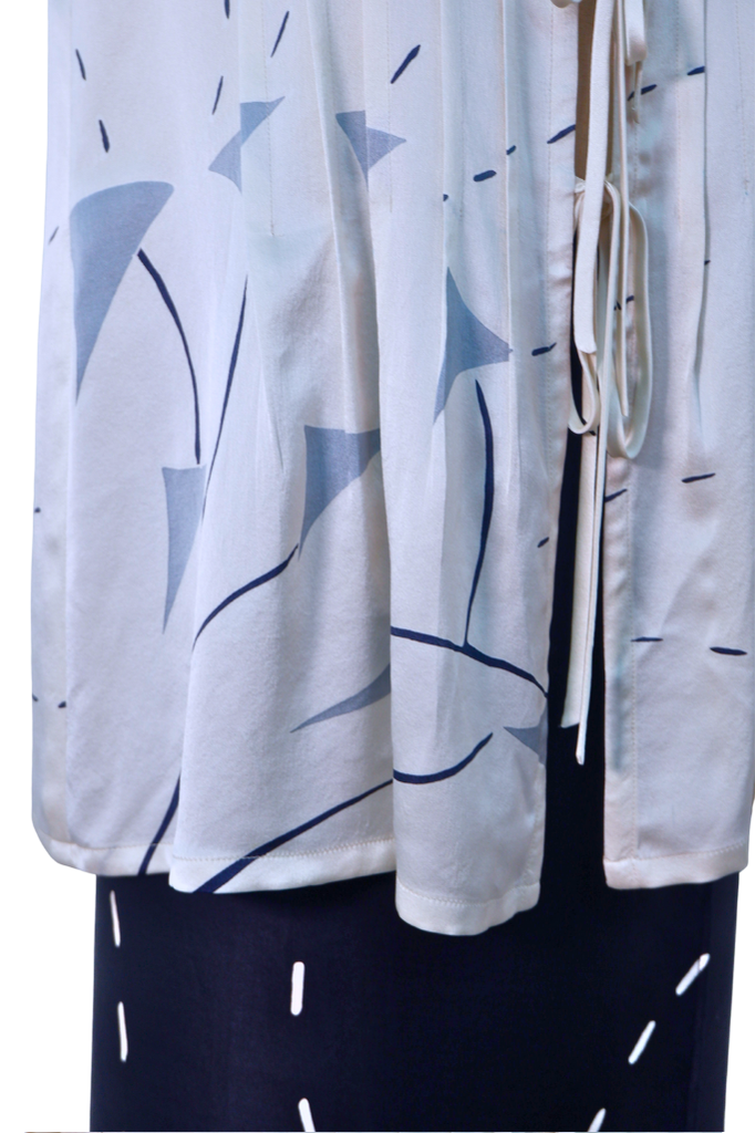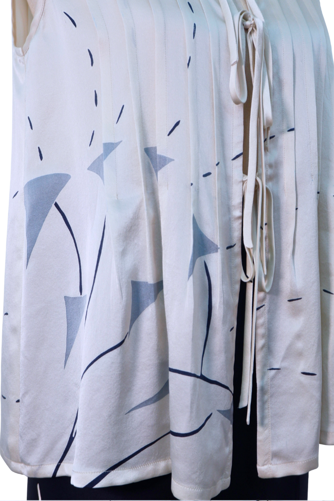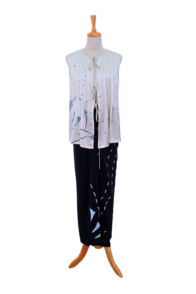 Pleated Blouse & Pareo Batik Ensemble crafted in hand-painted batik on silk satin using the traditional canting method. Hot wax is applied with a spouted tool, and dyes are then hand-painted with a brush to create intricate motifs. Each set is truly unique — no two are ever the same, reflecting the individuality of batik craftsmanship.