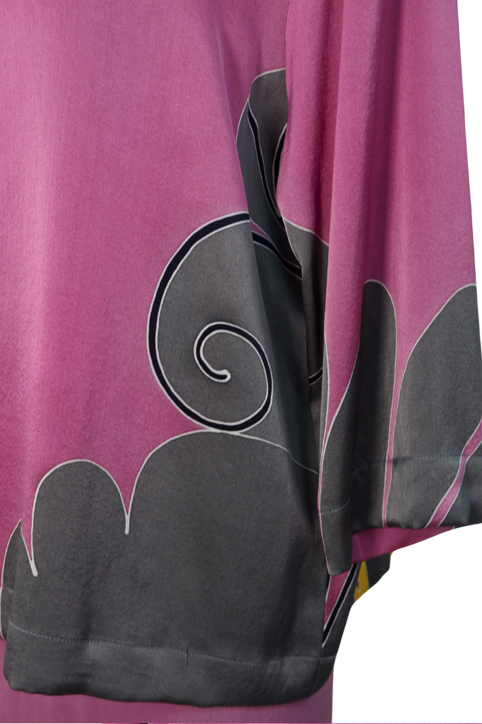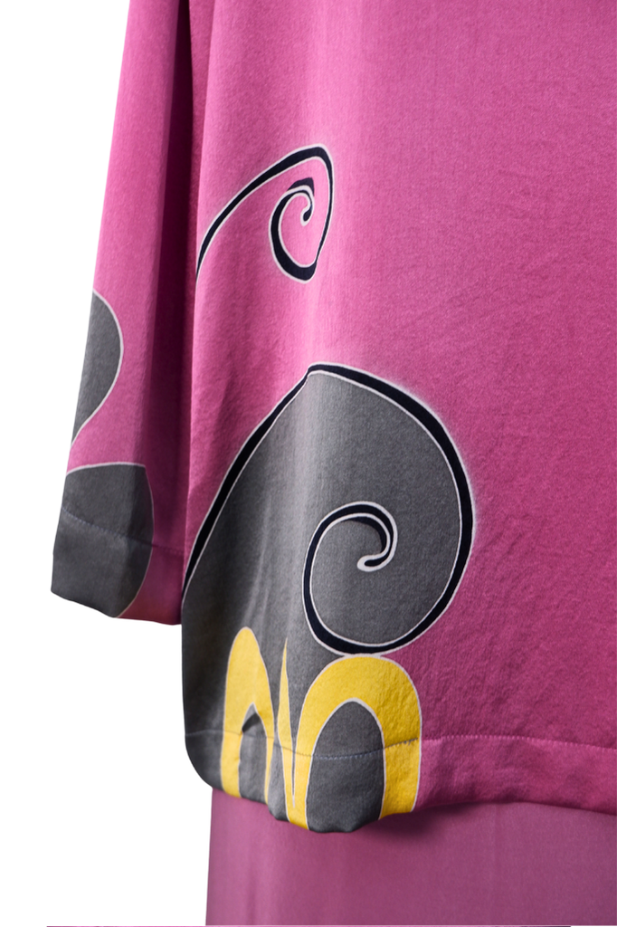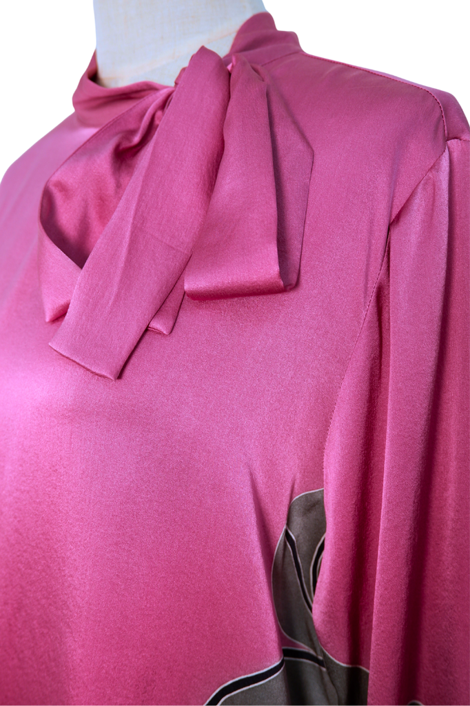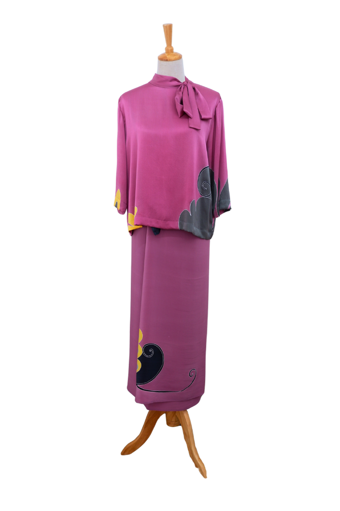 Ribbon Blouse & Pareo Batik Ensemble crafted in hand-painted batik on silk satin using the traditional canting method. Hot wax is applied with a spouted tool, and dyes are then hand-painted with a brush to create intricate motifs. Each set is truly unique — no two are ever the same, reflecting the individuality of batik craftsmanship.